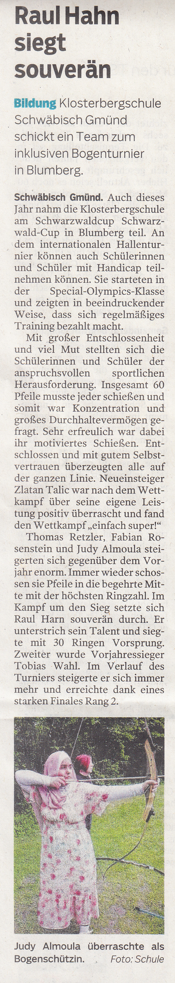 Bericht in der Gmünder Tagespost vom Bogenturnier in Blumberg